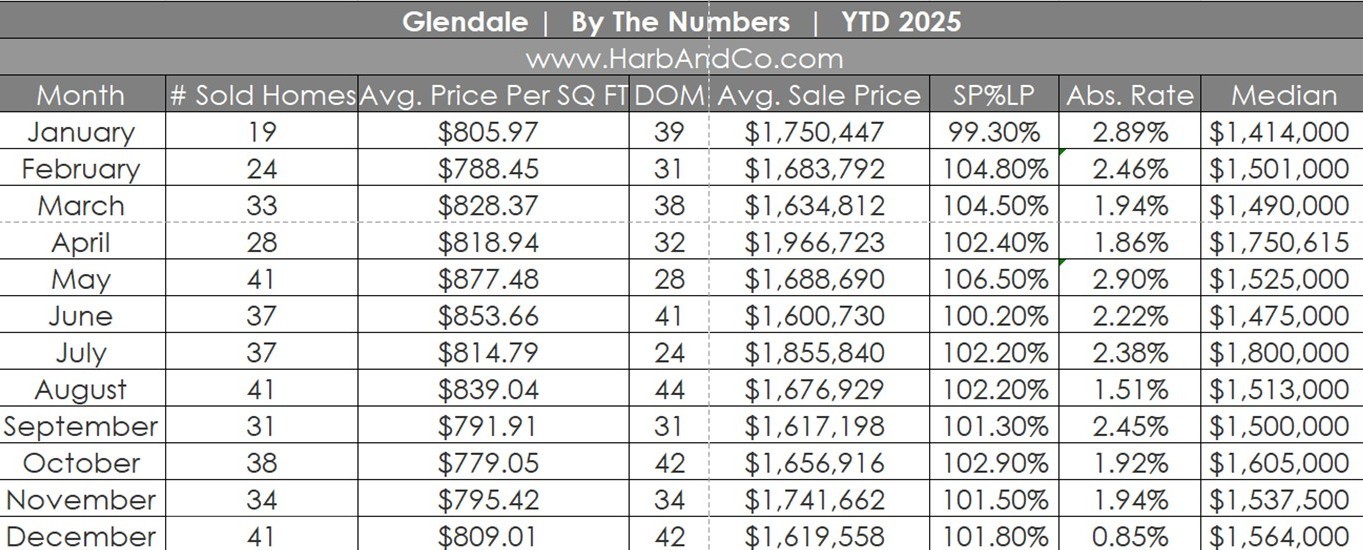 Let’s dive into the Glendale Real Estate Update for December 2025. Forty-one homes closed escrow last month—a solid showing for this time of year. Twenty-one homes sold over the asking price, two at the asking price, and eighteen below. A five-bedroom, five-bathroom home at 3422 Esperanza Terrace sold for $476.296 per square foot, while a two-bedroom, one-bathroom home at 1605 Santa Rosa sold for $1,171.88 per square foot.