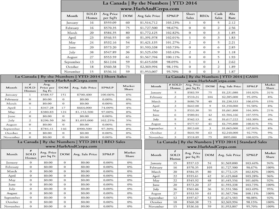 Last month (November 2014) 20% of La Canada real estate sales were sold to cash buyers. Only 15 La Canada homes sold last month.