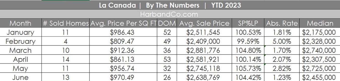 Let’s examine the La Canada Real Estate Market for June 2023. Out of the thirteen homes sold, eight sold over asking, one at asking, and four under the asking price. Thus, proving once again that it is wiser for a La Canada home seller to negotiate the price up rather than down.