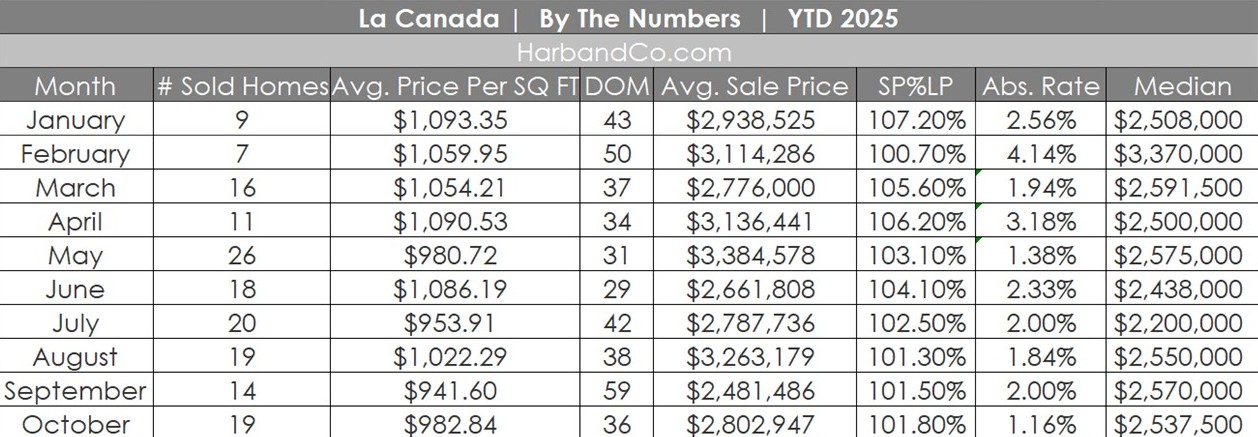 La Canada Real Estate October 2025: As one of La Canada’s best real estate agents, I strive to keep informed about current market conditions. Let’s dissect La Canada Real Estate for October 2025. Only nineteen homes closed escrow last month. Twelve homes sold above the asking price, two at asking, and five sold below the asking price. All sold for over one million.