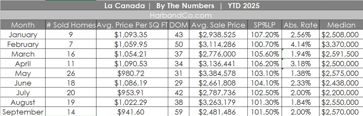 La Canada Real Estate September 2025: As one of La Canada’s top real estate agents, I strive to keep informed about current market conditions. Let’s dissect La Canada Real Estate for September 2025. Fourteen homes closed escrow last month—five homes sold above the asking price, two at asking, and seven sold below the asking price.