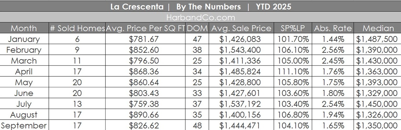 To maintain my status as one of La Crescenta’s most trusted real estate experts, I regularly examine the La Crescenta Real Estate market statistics. In September 2025, seventeen homes sold. Eleven properties sold for over their asking price, two sold at asking, and four sold for less than the asking price.