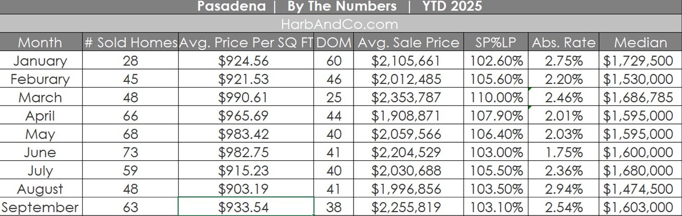 Let’s examine the Pasadena real estate market for August 2025. Last month, buyers closed sixty-three homes in Pasadena. Of those, thirty-two sold above the asking price, four met the asking price, and twenty-seven sold below it.
